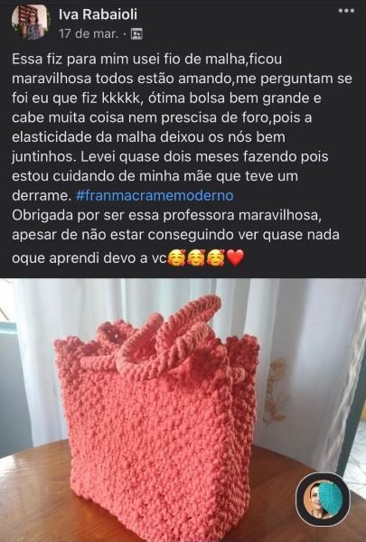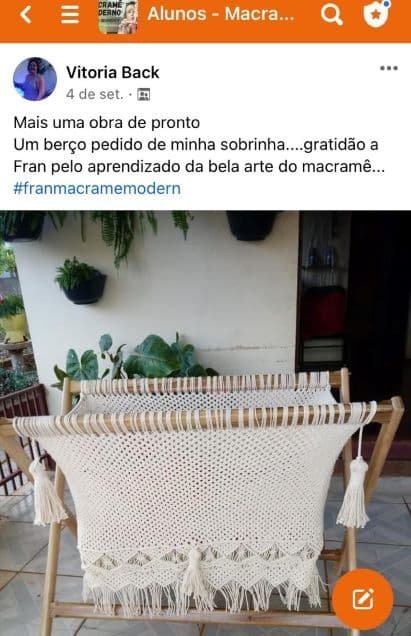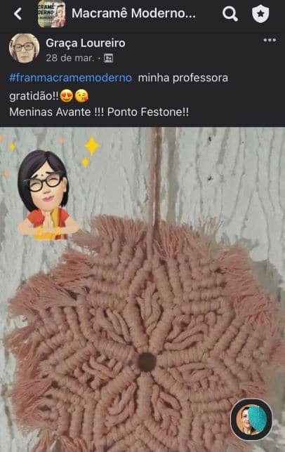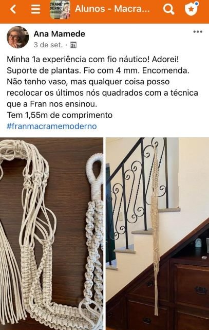 Sou especialista em Macramê, dona das redes sociais Fran Macramê Moderno e fundadora da Comunidade Macramê Moderno sem Segredos, meu curso que te leva do zero até suas vendas mais ousadas.